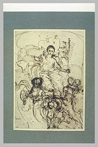 Identifié par A. Sutherland Harris ['Notes on the Chronology and Death of Pietro Testa, in Paragone, XVIII (1967), 213/33 (nov.), p. 55 note 62] comme une étude pour une allégorie de l'administration de la justice à Lucques, représentée de la même manière que l Allégorie de la Liberté, peinte à fresque par Pietro Testa dans le Cortile degli Svizzeri, au Palazzo Ducale de Lucques. A dater de l'époque du premier ou du deuxième séjour de l'artiste dans sa ville natale [ : en 1632 - voir A. Sutherland Harris, op. cit. ; F. Viatte, in R. Bacou, Dessins du Louvre. Ecole italienne, Paris, 1968, n° 94 - ou en 1637 - voir Ch. Thiem, Italienische Zeicnungen 1500-1800. Bestandskatalog der Graphischen Sammlung der Staatsgalerie Stuttgart, I, Stuttgart, 1977, sous n° 399 ; H. Brigstocke, Some further Thoughts on Pietro Testa, in Münchner Jahrbuch der Bildenen Kunst XXIX, 1978, p. 117 ; E. Cropper, in cat. exp. Pietro Testa (1612-1650) : Prints and Drawings, Philadelphie / Cambridge (Mass.), 1988-1989, n° 31]