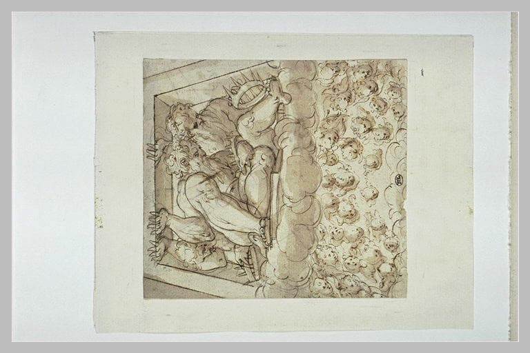 Trois vieillards dans une niche, chacun tenant une couronne ; chérubins