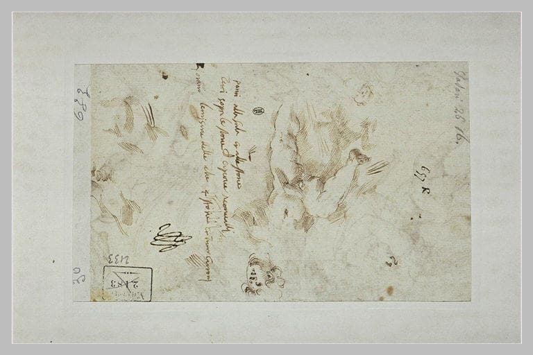 Plume et encre brune. Au centre, vers la droite, annotation à la plume et à l'encre brune, peu lisible, peut-être de la main de l'artiste :ponsi alla sala e alle storie [...] sopra le storie [...] le misure delle [...] 4 storie [...] cassoni. Collé sur les quatre côtés