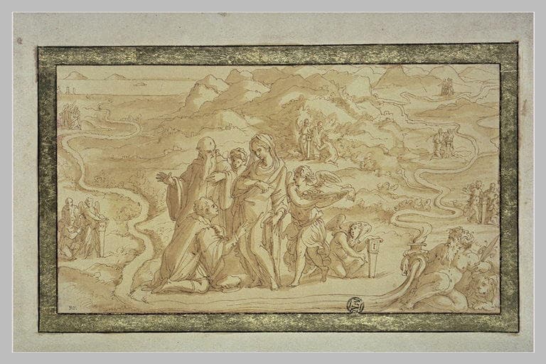 Autrefois attribué à Perino del Vaga (E. Jabach, inv. ms), puis classé parmi les feuilles d'Ecole italienne (Morel d'Arleux), ce dessin, ainsi que l'Inv. 2213, a été identifié par P. Barocchi (cat. exp. Mostra di disegni del Vasari e della sua cerchia, Florence, Gabinetto dei disegni e delle stampe degli Uffizi, 1964, n° 3 ; Id., Vasari pittore, 1964, n° 6a, cf. n° 6b) comme une étude préparatoire pour les fresques, aujourd'hui perdues, réalisées par G. Vasari dans l'Archicenobio de Camaldoli, illustrant la vie de saint Romuald (1538). Les deux peintures correspondantes aux dessins du Louvre sont mentionnées dans l'Autobiographie du Vasari (Ibidem).