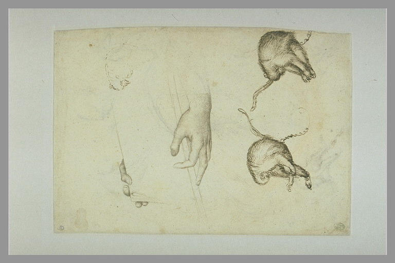 C'est aussi à Ferrare et dans l'enluminure que l'on trouve une descendance à certains motifs de singes. Celui dessiné en bas à droite, en train de s'épouller, a dû déterminer un modèle de répertoire, plus achevé, qui a été recopié bien souvent dans les bordures enluminées de la Bible de Borso d'Este (Modène, Biblioteca Estense, Ms. V.G. 12 = lat. 422, I, fol. 162, 245, 303) (D. Cordellier, cat. exp. Pisanello, le peintre aux sept vertus, Paris, Musée du Louvre, 1996, n° 197)