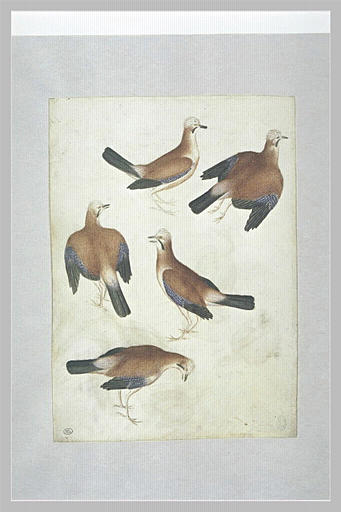 La position du geai vu de dos, à gauche, prouve à elle seule que des schèmes préexistaient à l'observation (et la guidaient peut-être) puisqu'elle est identique à celle d'un chardonneret (Carduelis carduelis) perché à droite dans la roseraie de la Madone à la caille (Vérone, Museo di Castelvecchi, Inv 164-I B-90). Le rapprochement, qui fait l'objet d'une confrontation de détails dans un ouvrage récent de B. Degenhart et A. Schmitt (1995), permet de constater la permanence des types. Il autorise aussi à supputer un écart chronologique entre les deux oeuvres [...]. Dessin autrefois placé en regard de l'Inv. 2473 (cat. 37) [...]. L'un des oiseaux de cette feuille - celui à droite dans le registre médian - a fait l'objet d'une citation dans un médaillon des bordures de la Bible de Borso d'Este (Modene, Biblioteca Estense, Ms. V.G. 12 = lat. 422, fol. 256 verso) (D. Cordellier, Cat. exp. Pisanello, Le peintre aux sept vertus, Paris, Musée du Louvre, 1996, n° 36)