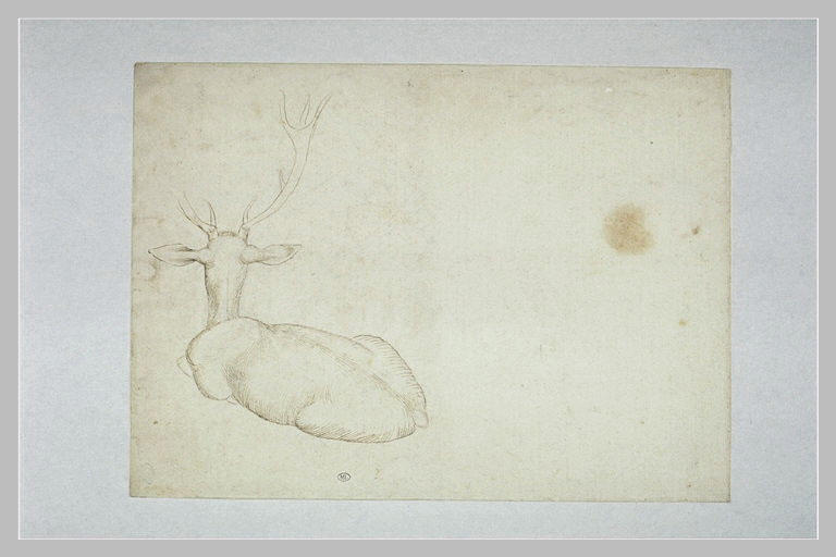 Stylet, et pointe de métal repassée à la plume et encre brune pour le cerf couché. Papier filigrané