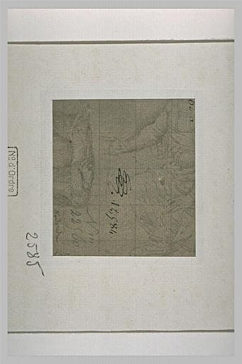 Cette feuille coupée participe des recherches qui conduisent à l'ange de la petite Sainte Famille autrefois dans la collection d'Hugo Brauner à Valence. Ce motif a fait l'objet d'une seconde étude à une échelle deux fois supérieure dans une autre feuille du Louvre (Inv. 6795). D. Cordellier signale une réelle parenté avec le Saint Philippe du Cenacolo de Léonard à Milan (Santa Maria delle Grazie), surtout si on le compare au dessin préparatoire de celui-ci (Windsor Castle, Royal Library, Inv. 12551) (D. Cordellier, dans catalogue d'exposition Fernando Spagnolo, Florence, Casa Buonarroti, 1998.) P. M. Ibanez Martinez (Dibujos y grabados en el proceso creador de Fernando Yanez, A.E.A., n° 278, 1997, pp.127-142) voit en cette feuille une première ébauche d'une idée abandonnée plus tard en faveur de celle qui est aujourd'hui reflétée au Calvaire (ancienne collection Montortal) et à la Pietà de la cathédrale de Cuenca. Ce même auteur a publié Fernando Yanez de Almedina. (La Incognita Yanez), Universidad de Castilla-La Mancha, 1999. (L. Boubli, Musée du Louvre, Département des Arts graphiques, inventaire Général des dessins de l'Ecole espagnole, XVIe-XVIIIe siècles, Paris, 2002, RMN, n° 24, p. 45)