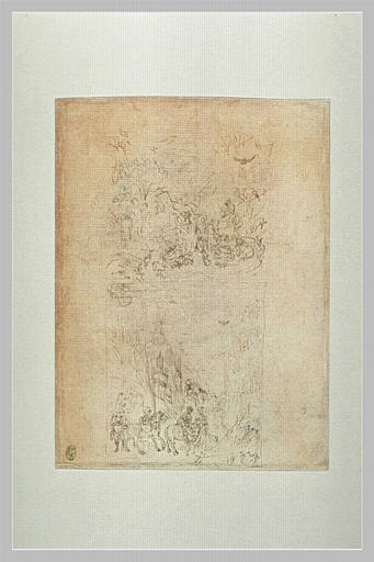 Plume et encre brune, tracé préparatoire à la pierre noire. En bas à droite, en marge de la composition à la plume et encre brune, tracé à la pointe sèche seule, cygne sur l'eau (?) ou reprise du dragon (?). Papier filigrané lavé de sanguine