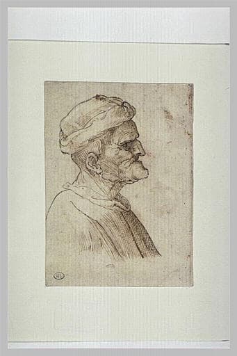 Buste d'homme de profil à droite, coiffé d'un turban et au menton proéminent
