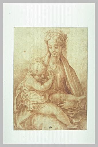 Classé parmi les Anonymes florentins, ce dessin a été rendu indépendamment à F. Salviati par B. Davidson et M. Hirst ; l'attribution a été acceptée par J. Shearmann (Andrea del Sarto, II vol., Oxford, 1965, II, p. 293 ; voir aussi D. Cordellier, cat. exp. Hommage à Andrea del Sarto, Paris, Musée du Louvre, 1986-1987, p. 116) qui a considéré le dessin comme une oeuvre de la jeunesse de l'artiste et l'a mis en rapport avec une composition perdue d'Andrea del Sarto, connue par des copies. Depuis, la critique a généralement rapproché la feuille du séjour de l'artiste dans l'atelier d'Andrea, à Florence (du printemps 1529 à la mort du maître, le 29 septembre 1530). Plus récemment Ph. Costamagna (in Francesco Salviati (1510-1563) ou la Bella Maniera, cat. exp. (Rome, Villa Médicis / Paris, Musée du Louvre, 1998), Milan, Paris, 1998, n° 6) a identifié l'Enfant comme une copie interprétative d'après la Sainte Famille Barberini d'Andrea del Sarto (Rome, Galleria Nazionale d'Arte Antica, Inv. 2332) et la Vierge comme une copie d'après la Madone du retable de Parmigianino, alors à Rome (Santa Maria della Pace) et aujourd'hui à Londres (National Gallery, Inv. n° 30). Il a ainsi proposé une relation du dessin avec une Vierge à l'Enfant que Francesco aurait peint pour le Cardinal Salviati à l'époque de son arrivée à Rome (G. Vasari, Le vite de più eccellenti pittori, scultori ed architettori, Florence, éd. Milanesi, 1906, VI, p. 11)