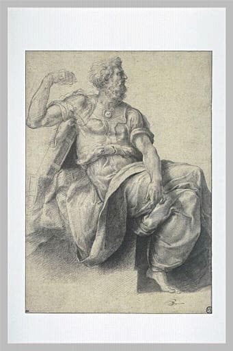 Ce dessin, ainsi que son pendant représentant saint Luc (Inv. 2814), a été identifié par Ph. Pouncey parmi les anonymes florentins (note ms. au verso du montage) et reconnu comme une étude pour l'un des quatre évangélistes de la voûte de la chapelle du Crucifix, dans l'église de San Marcello al Corso, à Rome, exécutés par Daniele da Volterra entre 1540 et 1543. M. Hirst a identifié, parmi les feuilles de Daniele conservées au Louvre, une étude pour le bras gauche du saint (Inv. 1495 ; M. Hirst, Perino del Vaga and his Circle, in Burlington Magazine, 761, CVIII, août 1966, p. 402) ; F. Sricchia Santoro a attribué à cet artiste nos deux dessins d'évangélistes (F. Sricchia Santoro, Daniele da Volterra, in Paragone, XVIII, 213, novembre 1967, p. 15). Daniele est aussi l'auteur d'une copie d'ensemble du groupe de saint Matthieu et saint Luc avec putti, conservée à Vienne (Albertina, Graphische Sammlung, Inv. Nr. 21222). B. Davidson a précisé l'histoire de la commande entreprise par Perino avant le Sac de Rome et reprise à l'époque de son retour de Gênes en 1539 par Daniele qui termina la décoration ; elle e a également étudié l'ensemble des études préparatoires (cat. exp. Mostra di disegni di Perino del Vaga e la sua cerchia, Florence, Gabinetto Disegno e Stampe degli Uffizi, 1966, sous n° 11, 45, 46 ; cf. cat. exp. Perino del Vaga tra Raffaello e Michelangelo, Mantoue, Palazzo Te, 18 mars-10 juin 2001, Milan, 2001, n° 60-61).