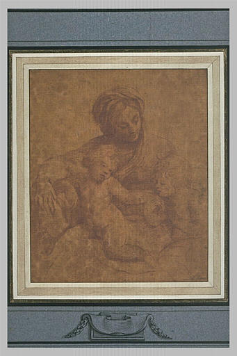 Saint Jean baisant la main de Jésus assis sur les genoux de sa mère