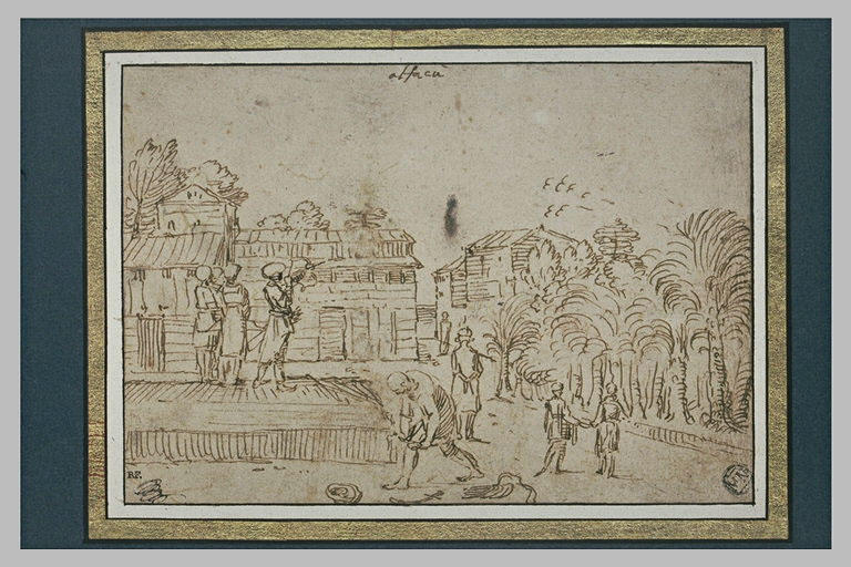 POP | Plateforme ouverte du patrimoineDevant les maisons d'un village, des chasseurs visant un vol d'oiseaux