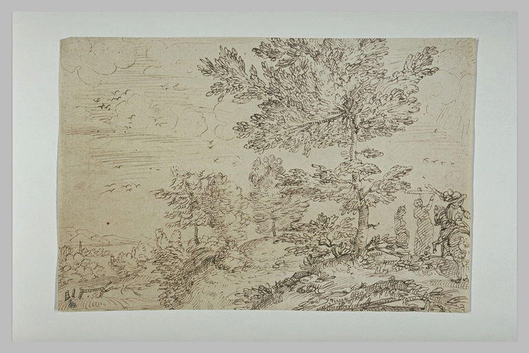Paysage boisé avec deux femmes et un cavalier se dirigeant vers elles