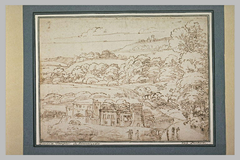 Dans un paysage vallonné, figures non loin d'une ferme fortifiée
