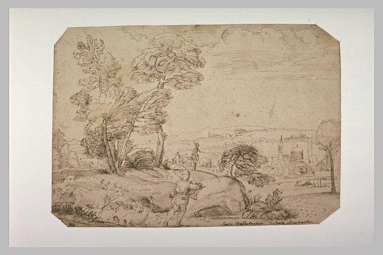 POP | Plateforme ouverte du patrimoineHomme jouant de la cornemuse, menant un troupeau aux abords d'une ville