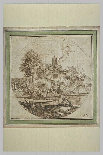 Fabrique fortifiée, parmi les arbres, avec un aqueduc, vue d'un étang