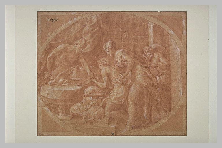 Collectionneur non identifié ; inscription à la plume et encre noire, en haut à gauche dans l'écoinçon : Bologne. - P. Crozat (?) ; annotation à la plume et encre brune, en bas à droite : 93 ; sa vente, Paris, 1741, peut-être partie du n° 407 ou du n° 408 (Primatice, à Noury) - Nourri ; sa vente, Paris, 1785, n° 460 (Primatice) - Ch.-P.-J.-B. de Bourgevin Vialart de Saint-Morys - Saisie des biens des Émigrés en 1793, remise au Museum en 1796-1797 ; marque Louvre (L. 1886). [Voir si le numéro 93 porté en bas à droite n'indique pas une provenance P. Crozat].