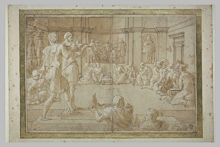 Etude pour la composition, aujourd'hui disparue, faisant partie du cycle de l'Histoire d'Alexandre, peinte dans la Chambre de la Duchesse d'Etampes, dite aussi Chambre d'Alexandre le Grand, à Fontainebleau (L. Dimier, Le Primatice., Paris, 1900, p. 434 n° 57). Une gravure a été tirée d'après la composition par Domenico del Barbiere (Ibidem) ; pour cette gravure P. -J. Mariette (Abecedario, IV, p. 214) précisait : Gravé au burin par Dominique del Barbiere Florentin. Peint dans la chambre d'Alexandre à Fontainebleau. C'est un des festins qu'Alexandre donna à toute sa cour dans le temps qu'il était assis sur le trône des rois de Perse, et peut-être celui qui fut suivi de l'incendie de Persépolis. Alexandre pourrait être le quatrième personnage assis à droite car celui-ci porte un casque cimier comme le héros dans les autres compositions préparatoires au même décor (L. Aldovini, tesi di Laurea, Milan, Università Cattolica, 1999, p. 293). Pour des études de draperies en relation avec cette composition voir le dessin à Paris, École nationale supérieure des Beaux-Arts, Inventaire M. 1160