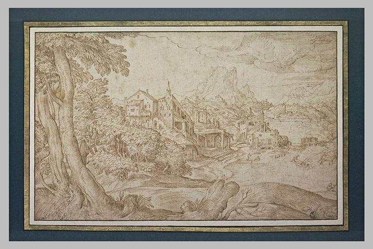 Paysage avec des batiments au bord de l'eau, cernés d'arbres et de montagnes