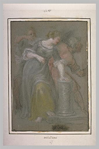 Une jeune femme appuyé sur une demi colonne et deux hommes