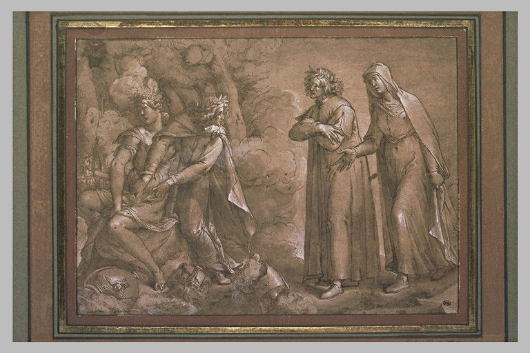 Dante Alighieri, Virgile, Cunizza, Sadeler Egidius gravure en rapport, Zuccaro Federico oeuvre en rapport, Cigoli Ludovico, Stradanus Giovanni, Dante Alighieri; Vienne, Albertina, oeuvre en rapport; Oxford, Christ Church Library, oeuvre en rapport; Dante, La Divine Comédie; iconographie religieuse; Dante et Virgile rencontrent Cunizza