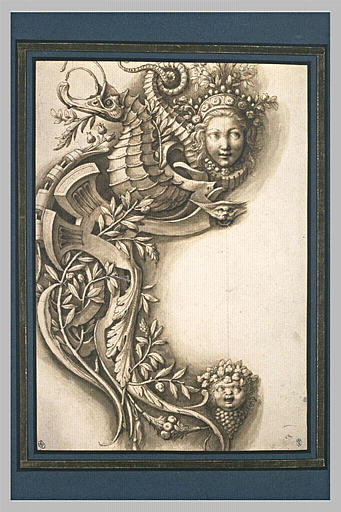 Cette oeuvre fait partie d'une série de cartouches à sujets pour la plupart macabres, comprenant les feuilles Inv. 5040, 5041, 5042, 5043 et 5044 du Louvre, les feuilles Inv-Nr. 217, 218, 219 et 220 de l'Albertina, un dessin passé en 1983 sur le marché londonien et représentant L'Amour tendant son arc (Colnaghi, juin-juillet 1983, no 11) et un cartouche avec les attributs d'un cardinal signalé par Françoise Viatte et actuellement conservé au musée des Arts décoratifs de Paris. On peut également rapprocher de ces dessins le projet de frontispice n. 424 Orn des Offices. On ignore si ces memento mori étaient liés à une commande ou si Jacopo Ligozzi les élaborait comme des projets à part entière. Françoise Viatte, considérant la présence de la couronne des Habsbourg sur la feuille Inv. 5043, avance l'hypothèse d'une commande impériale. (...) Les deux Natures mortes de sujets macabres de la collection anglaise Aberconway, à Bodnant, qui datent de 1604, sont emblématiques de cette veine. (...) C'est le seul cartouche de la série à ne pas présenter de symboles macabres. Cette feuille atteste une extraordinaire fantaisie d'invention et un talent remarquable, aussi bien pour le dessin que pour la mise en page, avec les motifs végétaux structurant l'encadrement surmonté de la silhouette sinueuse d'un hippocampe. (L. Conigliello, Ligozzi, Paris, Louvre, 5 Continents, 2004, (Cabinet des dessins), n° 30-31, 34-36, p. 74, 75)
