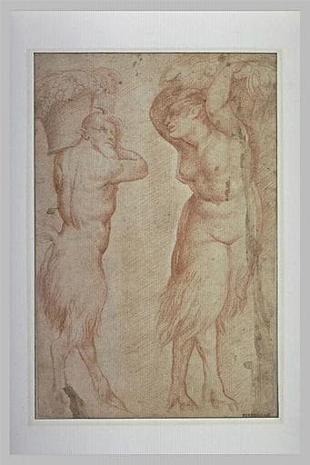 Satyre et satyresse debout, portant l'un et l'autre une corbeille de fruits