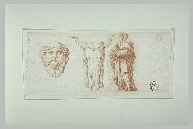 Masque antique ; crâne de bovidé ; homme masqué, drapé ; esquisse d'un homme