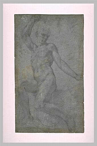 Jeune homme nu assis, brandissant une épée de la main droite, et une main