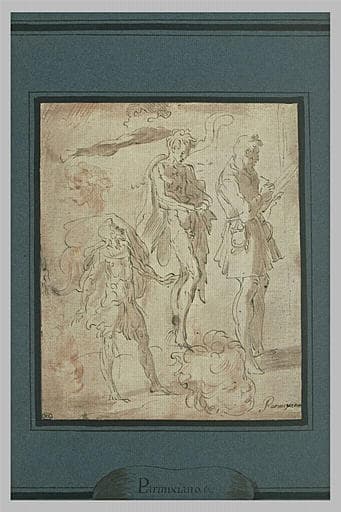 Etudes de trois hommes, dans diverses attitudes, et de trois têtes