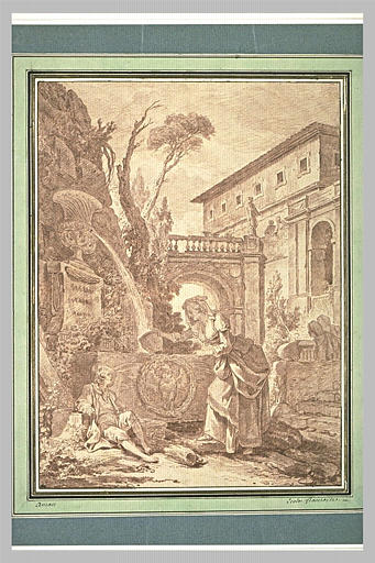 Des ruines sur le devant desquelles on voit un homme et une femme