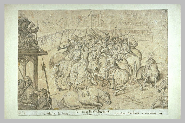 Annotation à la plume et encre brune : Tournoi de Sandricourt, n°4, Combat à la foule au carrefour ténébreux, le 18 septembre 1493