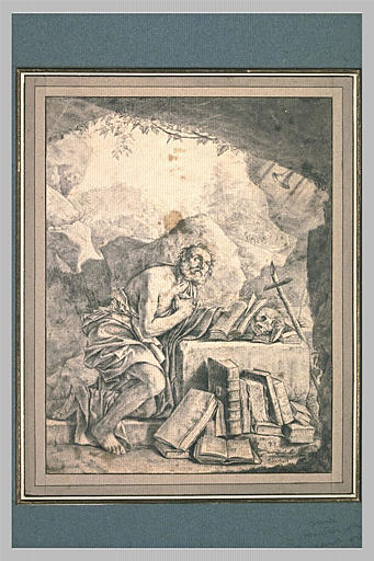 figure (saint Jérôme, agenouillé, prière, nudité, crâne, livre, crucifix, pierre, mortification, grotte)