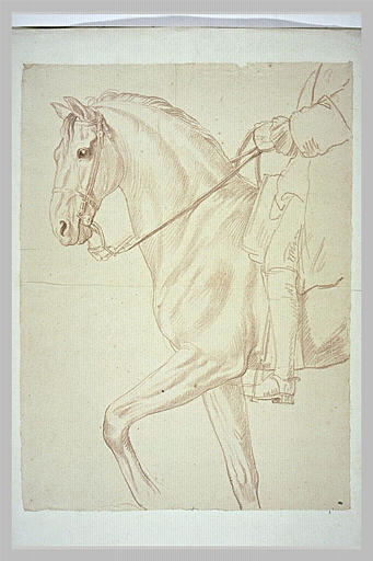 Partie antérieure d'un cheval et indication du cavalier, de profil