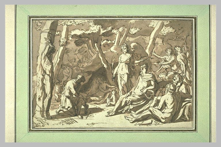 attribution par Jean-Claude Boyer en 1996. Au 18e attribué à Nicolas Poussin, puis le dessin entra au Louvre classé sous les anonymes