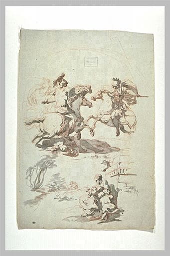 Combat de cavaliers romains, et une mendiante avec deux enfants