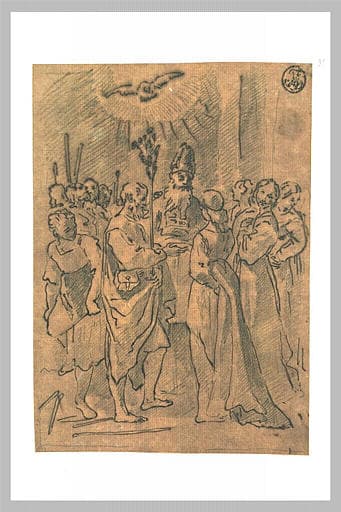Le musée du Louvre conserve un ensemble de dessins cités dans l'inventaire des dessins appartenant à l'évêque de Reggio Emilia, Paolo Coccapani en 1650, publié par Campori (G. Campori, Raccolta di cataloghi ed Inventarii Inediti di Quadri, Statue, Disegni, Bronzi,..., Modène, 1870, p. 142-159), sous le titre un libro con la vita della Madonna di Ludovico Carraccia'. Une partie des dessins de la collection étant entrés dans la collection des ducs d'Este, on retrouve dans les inventaires de la Camera Ducale plusieurs feuilles de ce livre. Cet ensemble a été entrepris entre 1590 et 1600, sous la direction de Ludovico Carracci et en partie par lui, et a été utilisé comme modèle par les membres de l'atelier qui en ont fourni des copies, parvenues dans la collection par l'intermédiaire de Jabach. Les dessins sont aujourd'hui dans un état critique du fait d'avoir été exposés longtemps sur les parois de la Camera Ducale de Modène. (C. Loisel, Musée du Louvre, département des arts graphiques, Inventaire général des dessins italiens, VII : Ludovico, Agostino, Annibale Carracci, Paris, RMN, 2004, n° 96, p. 128). Ce dessin est une copie exécutée à Modène, en 1713, par Nicolas Vleughels d'un dessin de l'ensemble attribué à Ludovico Carracci et conservé au Louvre (Inv. 7742). Hercenberg, 1975, n° 398, fig. 244 ; Loisel Legrand, 1998, p. 35
