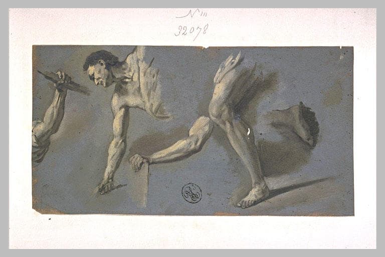 Buste d'un homme penché, deux bras, une jambe et un pied