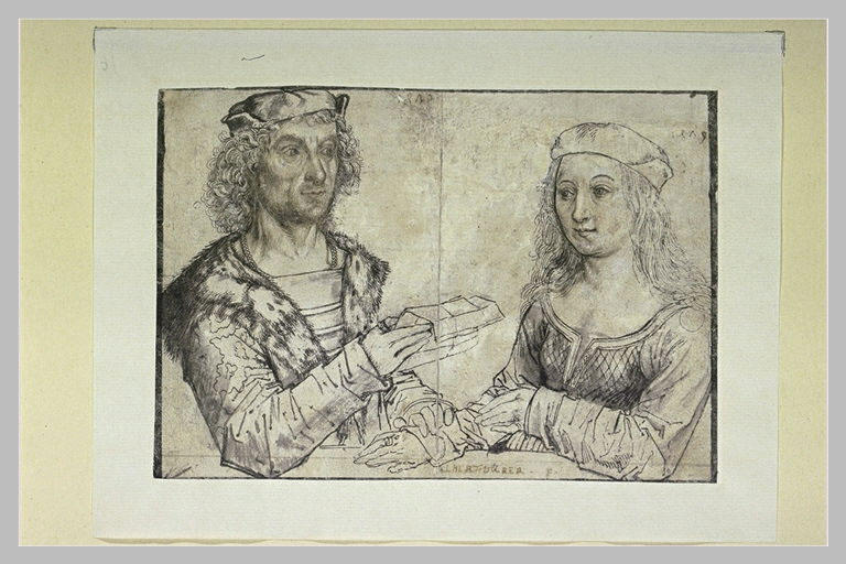 En haut au milieu la date1479' répétée à la droite de la femme. En bas au milieu, l'inscription :ALBERT DURER F' d'une encre pâle, écrite postérieurement Filigrane : tête de boeuf presque informe