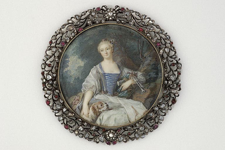 portrait (Pompadour marquise de, Poisson Jeanne Antoinette, femme, représenté en : bergère, à mi-corps, assis) ; fond de paysage