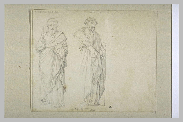 Saint Barthélemy et saint Pierre d'après un dessin de Victor Orsel copiant lui-même un tableau de l'Académie de Pise. Contrairement à ce qu'indique le registre d'inventaire, la figure de gauche ne représente pas saint Paul (dont un des attributs est l'épée) mais saint Barthélemy, muni ici du coutelas qui a servi à l'écorcher. L'inscription indique que le tableau était conservé à l'Académie de Pise. Il est aujourd'hui au Museo Civico, et attribuable à Taddeo di Bartolo (Antonino Caleca, communication orale). Périn copie ici comme il l'indique lui-même, non pas directement le tableau italien mais un dessin de Victor Orsel exécuté en 1827. La date est intéressante : elle implique un séjour, jusqu'ici, non documenté d'Orsel à Pise en 1827. Le dessin d'Orsel, réapparu, en 1982 (vente Paris, Nouveau Drouot, salle n° 3, lundi 6 décembre 1982, sous le n° 167, non décrit), acquis par un amateur parisien, vient d'entrer au musée des Beaux-Arts de Lyon. Ce type d'études minutieusement fidèles étaient destinées par Orsel et Périn à servir de substrat formel et spirituel à d'autres études dessinées préparatoires à leurs propres entreprises décoratives. (G Chomer, Musée du Louvre, Cabinet des dessins - Inventaire Général des dessins français, Lettre P, Paris, 1997, R.M.N. n° 1001, p. 256.)