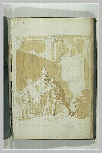Album Ecole française XVIIIeme siècle -1-, folio 26, dessiné au verso ; Album relié en veau (reliure du XVIIIeme siècle), dos orné de motifs d'or et portant le titre :CIRCE. Ex-libris sur le contreplat de devant. Scènes antiques et mythologiques. Nombreuses traces de folios arrachés et folios détachés. H. 0,390 ; L. 0,265. ; Album pris dans l'autre sens