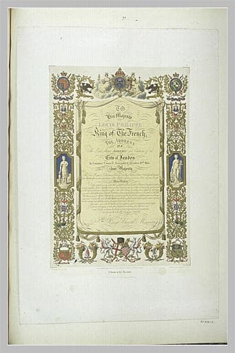 Album Pingret Edouard, folio 67, rapporté au recto ; Album factice de 109 folii numérotés de 1 à 111 (RF 6952 à RF 7108, le RF 7052 détaché) sur lesquels sont collés des dessins originaux, des lithographies, cartes et extraits de journaux relatifs au voyage de Louis-Philippe au château de Windsor en 1844. Un manuscrit de 117 feuillets numérotés l'accompagne. L'album est préparatoire au recueil de lithographies :Voyage de S.M. Louis-Philippe 1er, roi des Français au château de Windsor, publié à Paris par Pingret et à Londres par Ackermann, le 31 janvier 1846. Il connu un succès identique au recueil de Skelton : Le Château d'Eu illustré, depuis son origine en 912 jusqu'au voyage de sa majesté Victoria, [...] , Paris, 1844. Le musée Louis-Philippe, château d'Eu, conserve les deux recueils (inv. 974-19 et 984-6) et un exemplaire de Pingret illustré de lithographies en couleurs. Le fonds de la Maison de France, aux Archives nationales, conserve le recueil de Pingret (300 AP 111 33 bis)