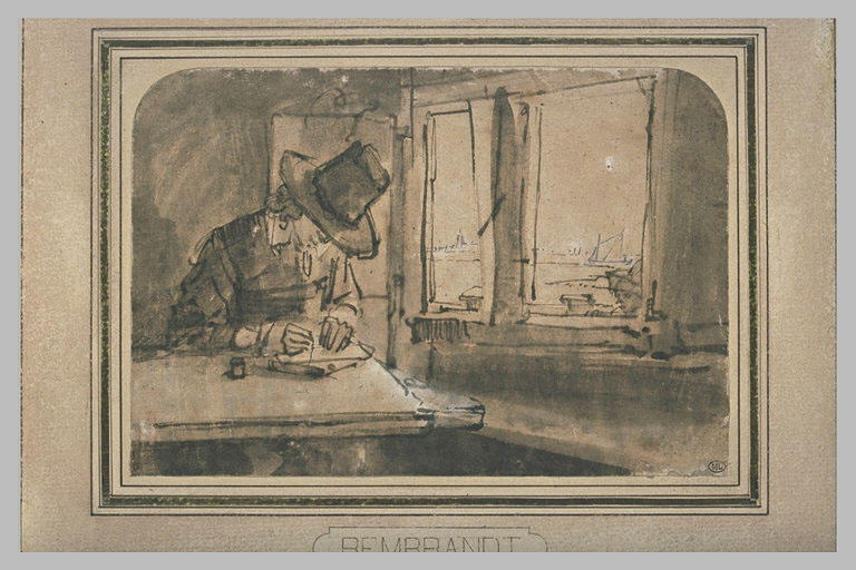 Seul dessin que Moreau-Nélaton possédait de Rembrandt, mais non des moindres, provenant de la collection Laches-Ravaisson-Mollien. Le modèle est un des protecteurs et amis de Rembrandt dans les années 1650, le bougmestre Jan Six, représenté écrivant près d'une fenêtre donnant sur l'Ij, avec au fond l'église de Schellingwon. (Grand-Palais, 1991)