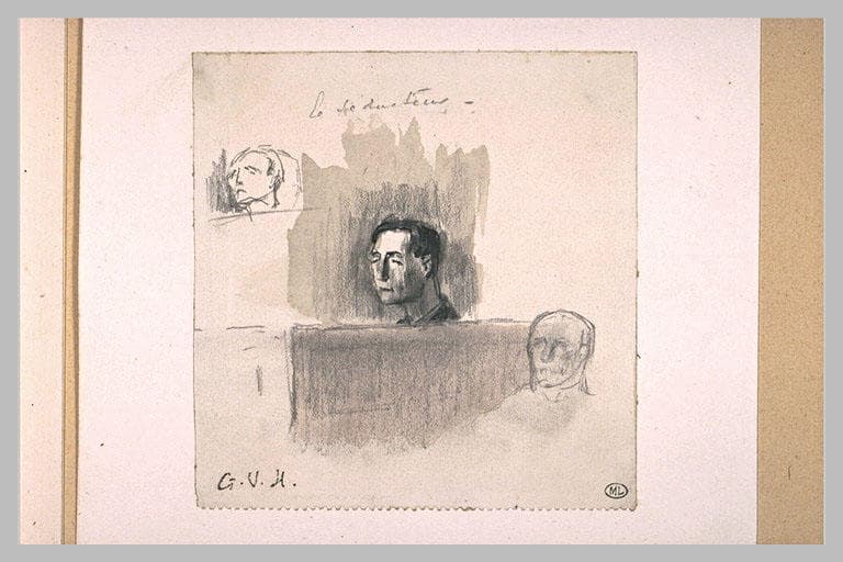 Tête d'homme émergeant du box des accusés ; deux études de têtes