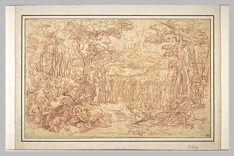 scène mythologique (Enée, foule, Muse) ; fond de paysage (montagne, arbre, soleil)
