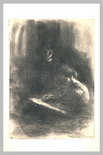Femme de trois quarts à gauche, assise devant une table et autre figure