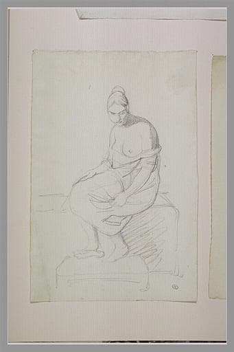 Femme assise, la poitrine découverte, de trois quarts à gauche