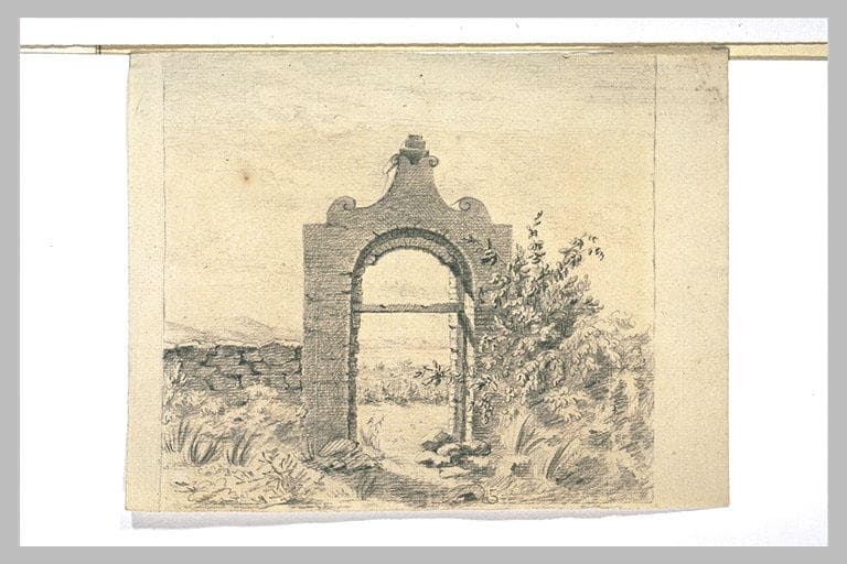POP | Plateforme ouverte du patrimoinePorte à arc rond en ruine surmontée d'un fronton, et paysage montagneux