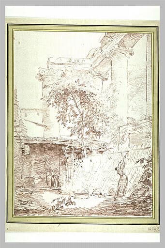 Femme étendant du linge, dans une cour, à l'ombre de colonnes antiques