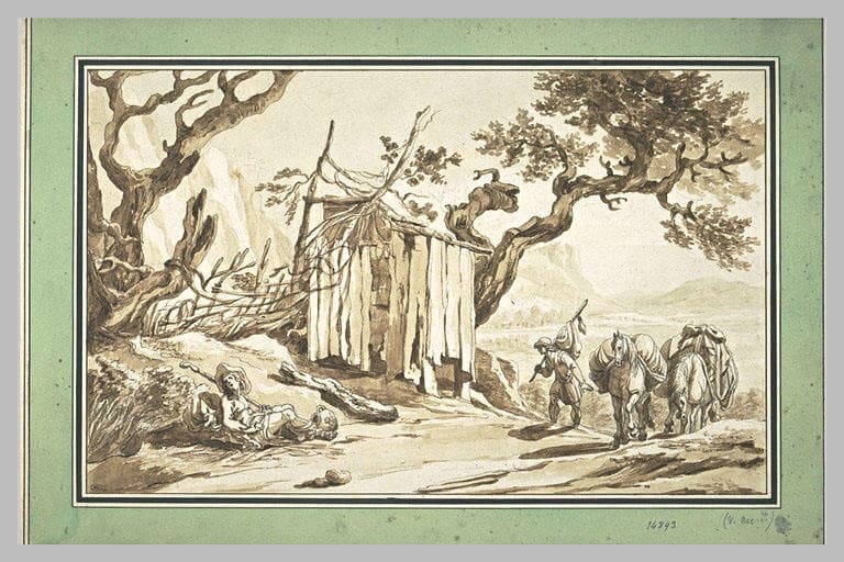 POP | Plateforme ouverte du patrimoineVoyageur avec des chevaux approchant d'un homme étendu près d'une hutte