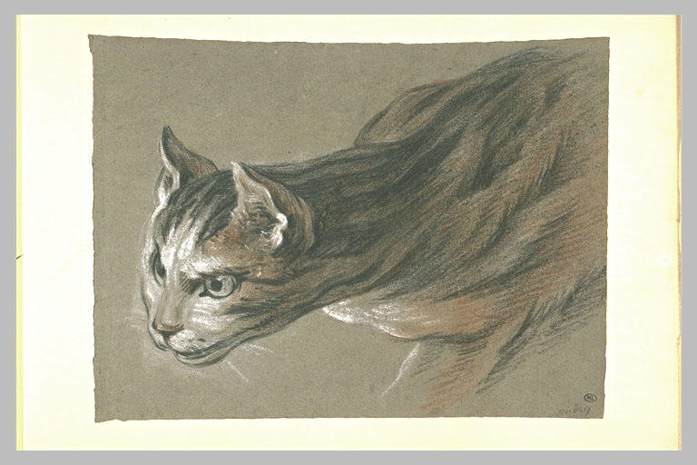 Annotation, en bas, à droite : oudry. Annotation au verso du montage : Etude de chat pour la peinture Le Déjeuner maigre (Munich) et réplique [...] vers 1700-1710, peinture de Desportes et non d'Oudry ([...]) le 18 octobre 1954 Maurice Sérullaz
